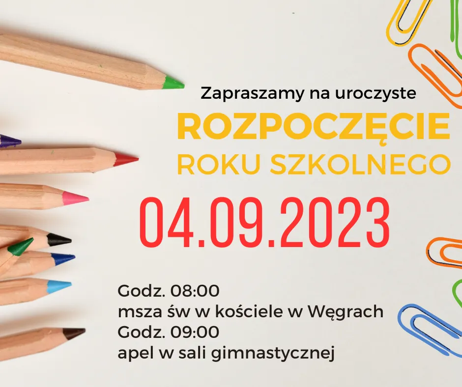 Rozpoczęcie roku szkolnego 2023/2024 odbędzie się 04 września godz. 8,00 – Msza Św. w kościele w Węgrach godz. 9,00 – inauguracja roku szkolnego w szkole, apel w sali gimnastycznej dziękuję z piękną grafikę na rozpoczęcie roku Pani Katarzynie Wosiek 🙂
