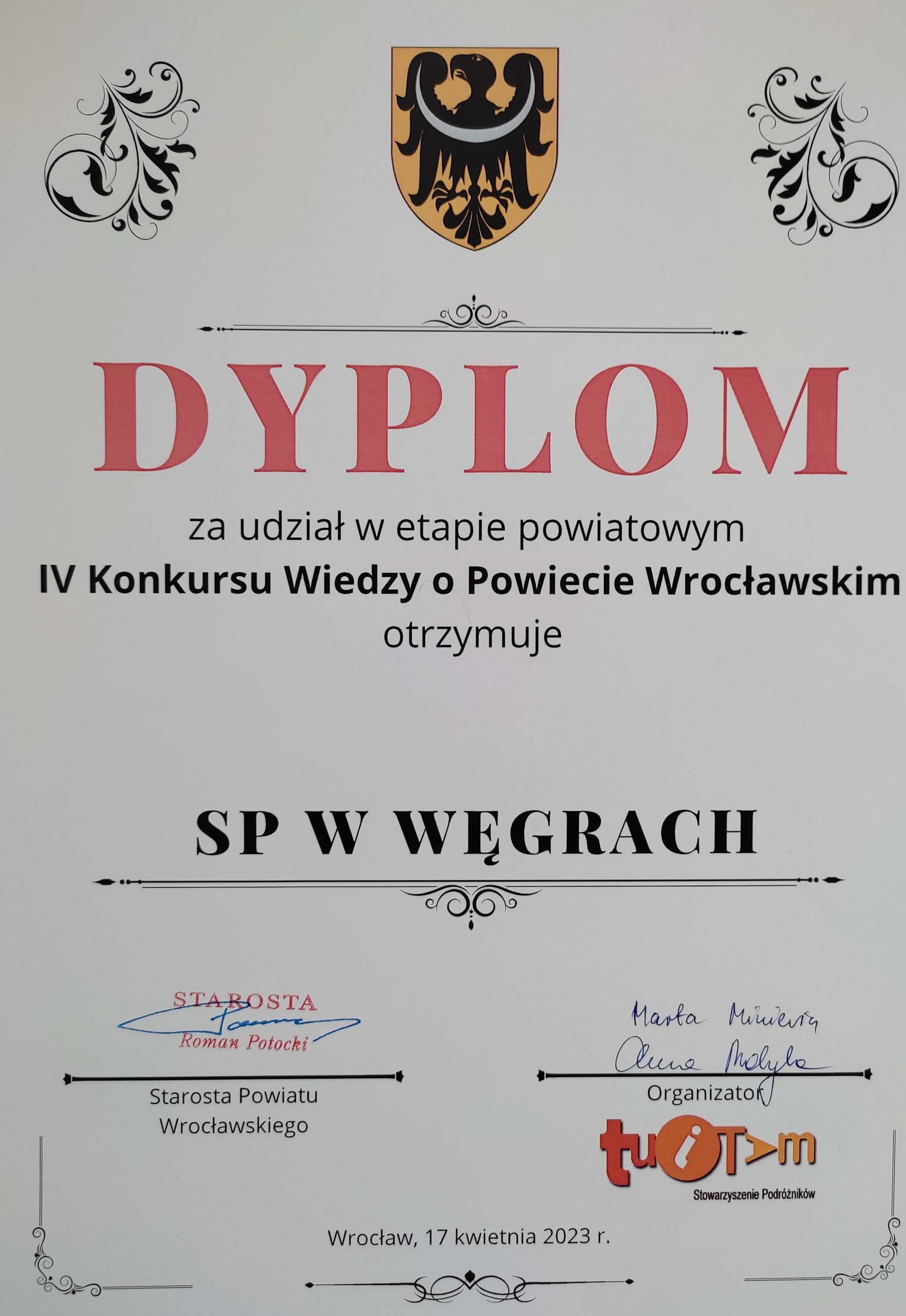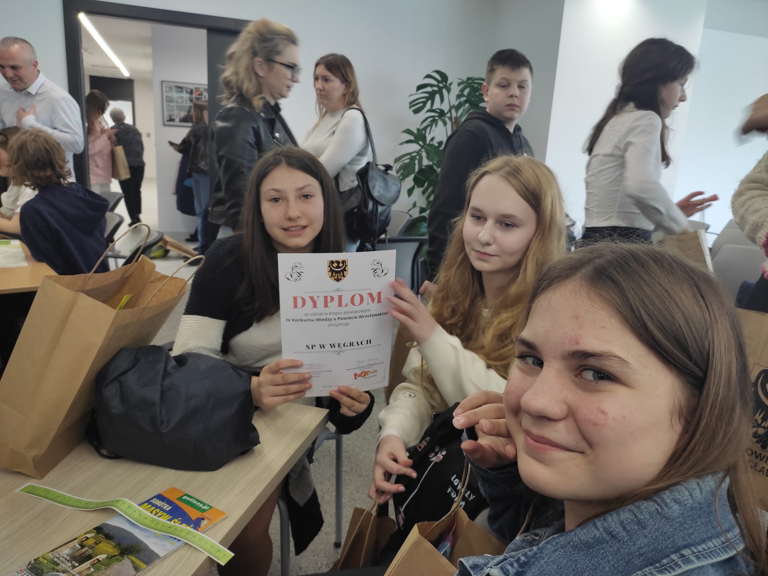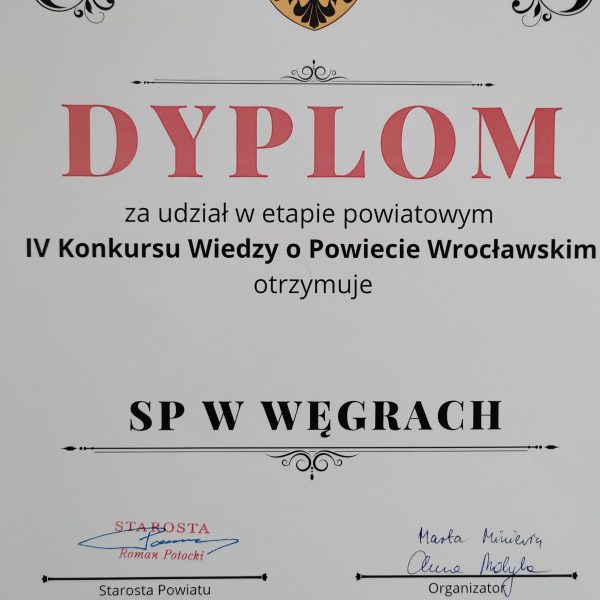 Uczennice kl. 7 Maja Gołaszewska, Magdalena Struczyńska oraz Karolina Andryśkiewicz, które najlepiej napisały w marcu etap szkolny, reprezentowały dzielnie naszą szkołę  w „IV Konkursie Wiedzy o Powiecie Wrocławskim”. Odbył się on 17.04.23r. w siedzibie Starostwa Powiatowego. Zorganizowany on został przez Stowarzyszenie TUITAM oraz Starostwo Powiatowe we Wrocławiu. Dziewczyny bardzo dobrze napisały etap powiatowy i dzięki temu udało się  zakwalifikować się do 10 drużyn, które startowały w etapie finałowym. Nagrodą dla wszystkich finalistów jest udział w wycieczce krajoznawczej. Gratulujemy wiedzy oraz sukcesu!!