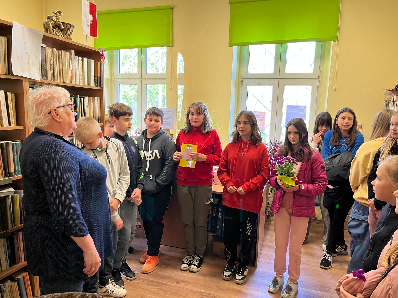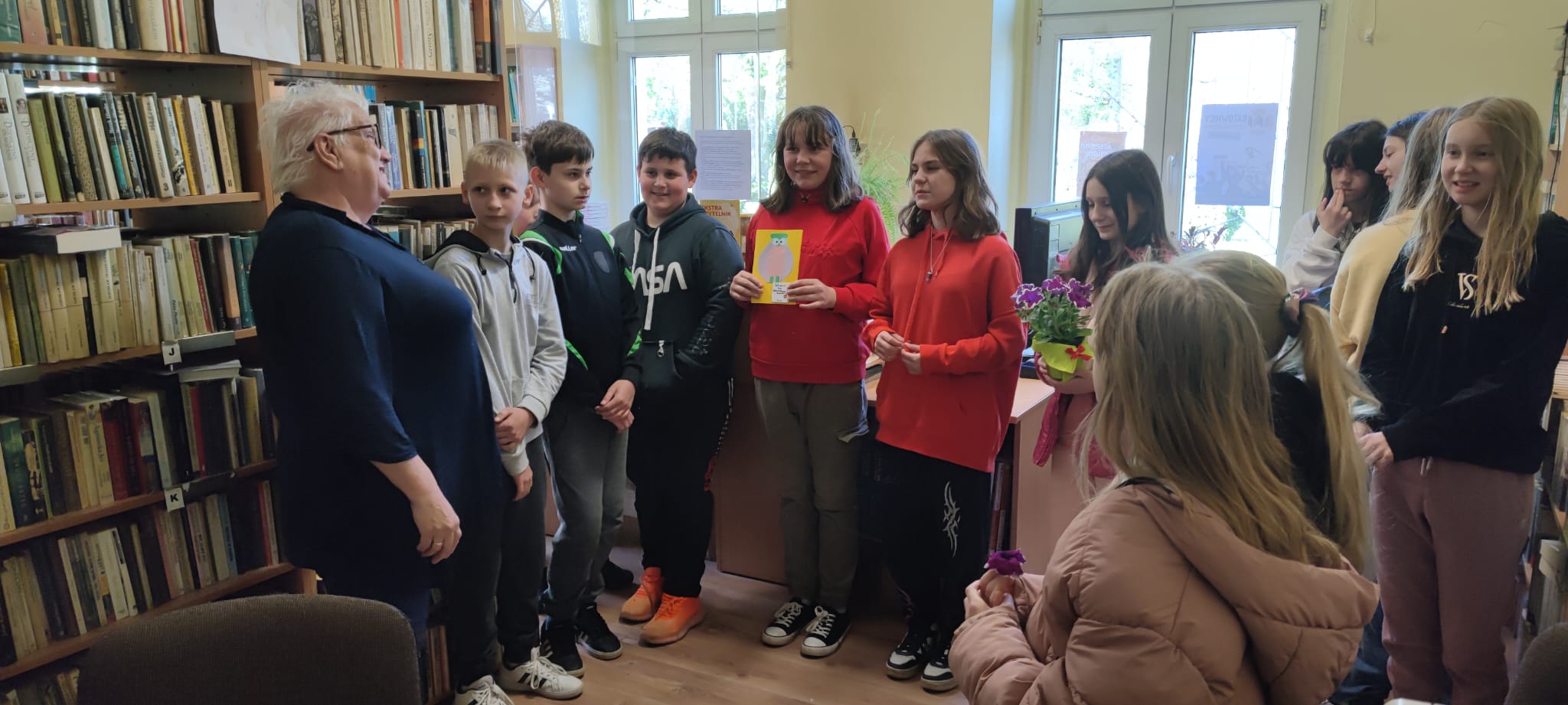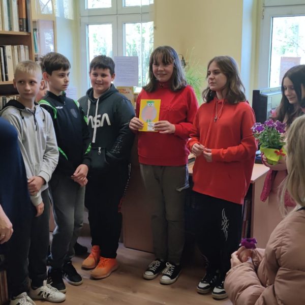 Z okazji Dnia Bibliotekarza nasi uczniowie wybrali się z wizytą do Biblioteki Wiejskiej w Węgrach, aby złożyć życzenia naszej Pani Bibliotekarce -Bożenie Krawczyk