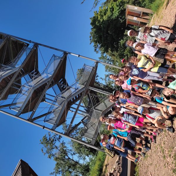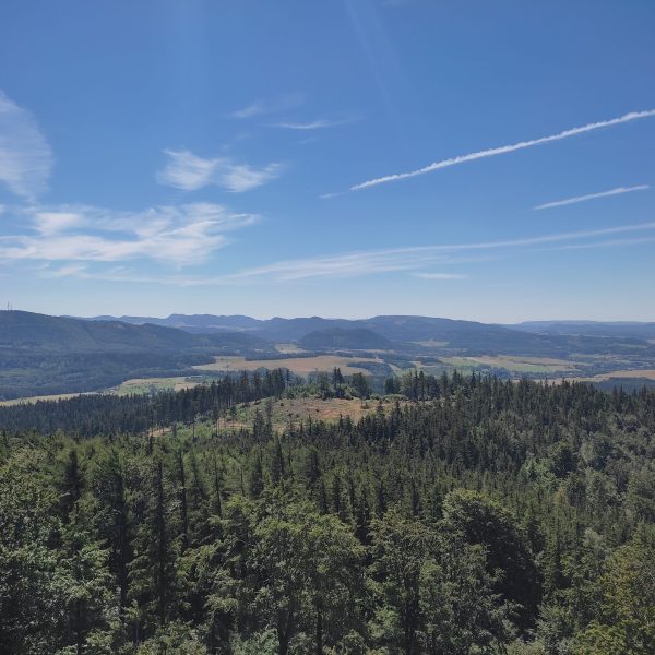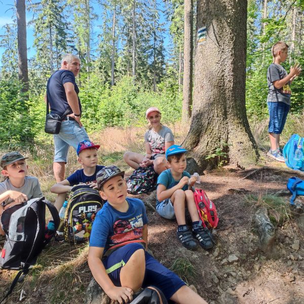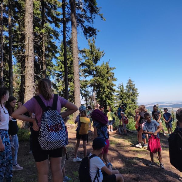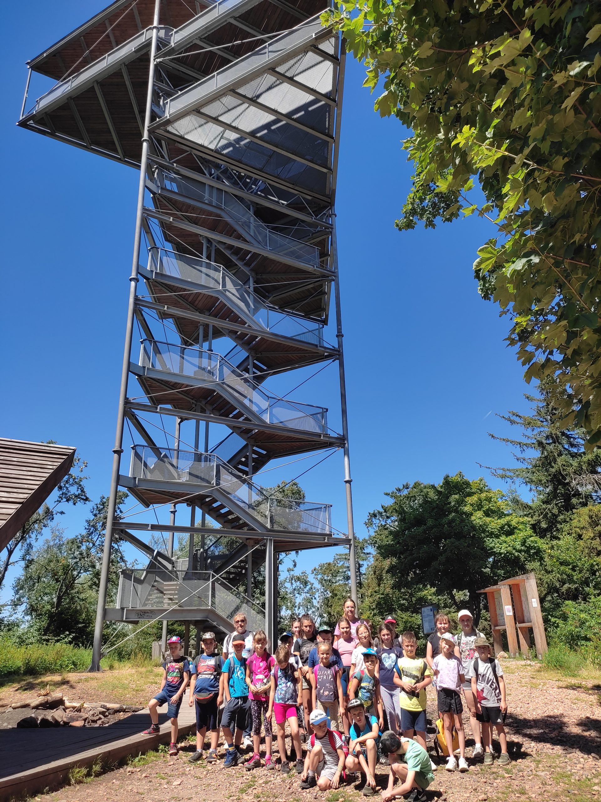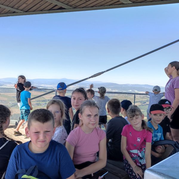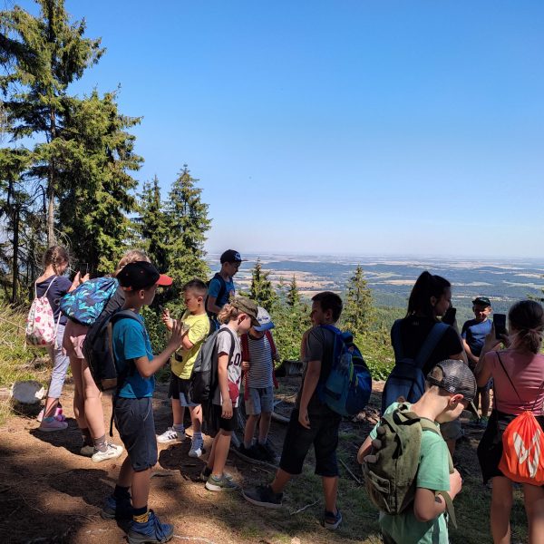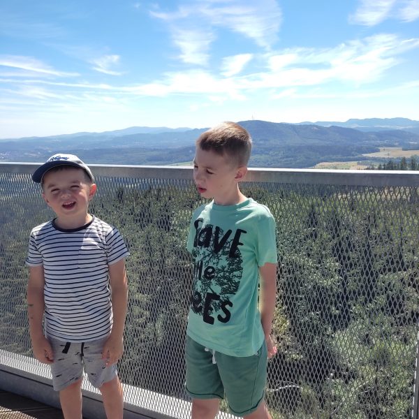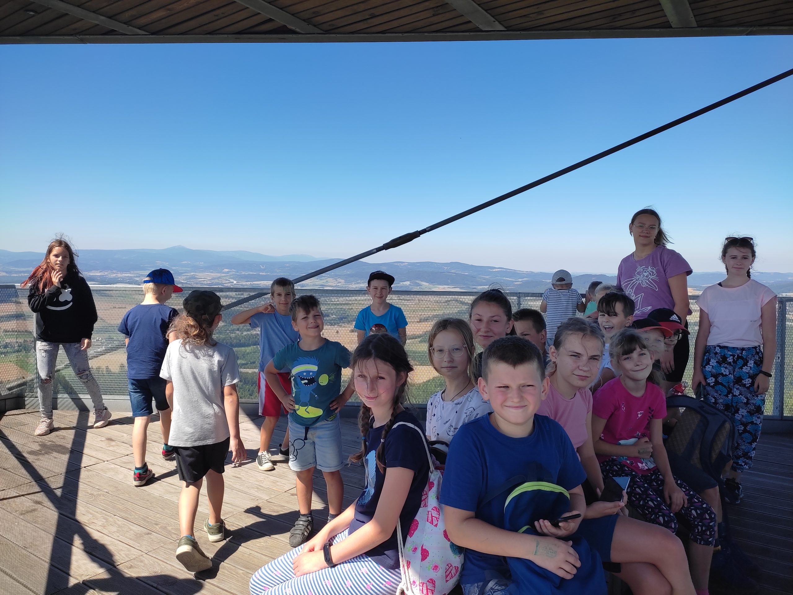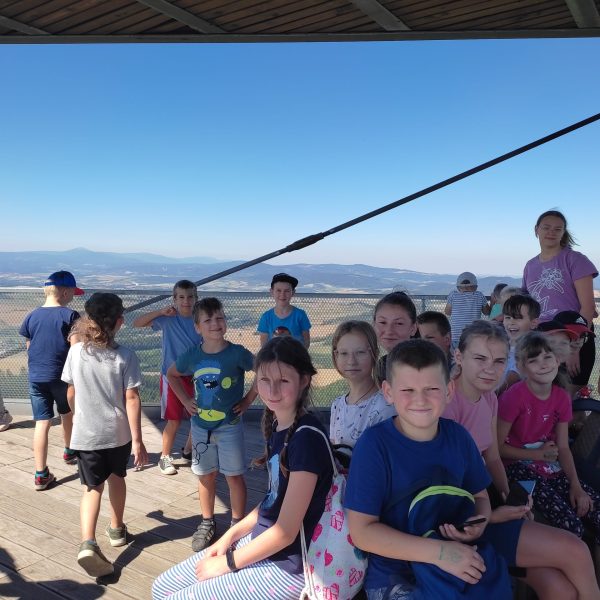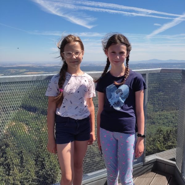 25.07.22r. rozpoczęliśmy nasze półkolonie zdobyciem szczyty Trójgarb (778 m n.p.m.) w Górach Wałbrzyskich. Szliśmy najłatwiejszym żółtym szlakiem z Lubomina, który wiedzie bardzo malowniczą trasą. Na szczycie czekała nas piękna wieża widokowa. Wieża widokowa na Trójgarbie została oddana do użytku pod koniec 2018 roku. Obiekt powstał w ramach programu „Ekomuzeum wokół Trójgarbu”. Budowla ma 27 metrów wysokości i aż pięć tarasów widokowych zawieszonych na różnych wysokościach! Imponujące konstrukcja a widoki z góry cudowne 🙂 Będzie co wspominać po wakacjach 🙂