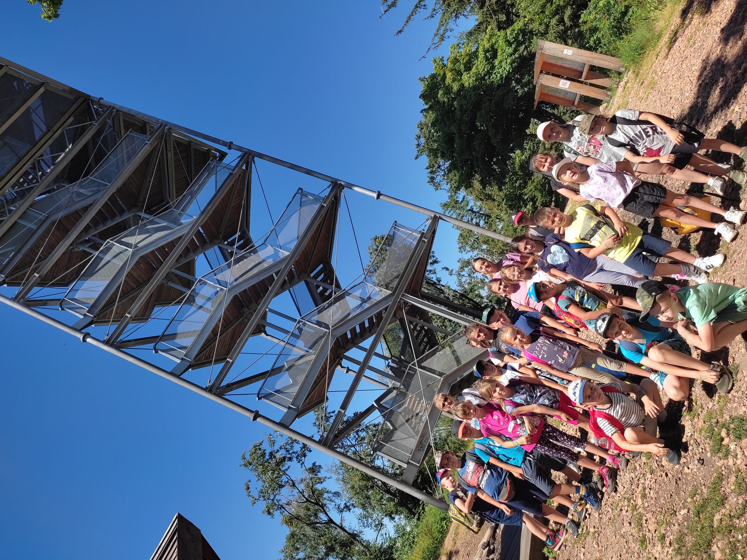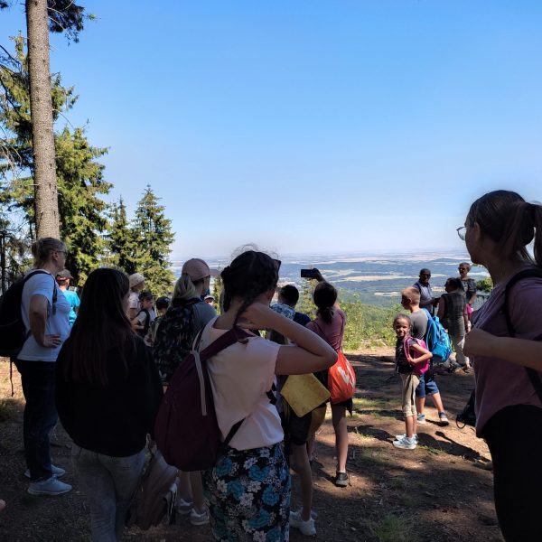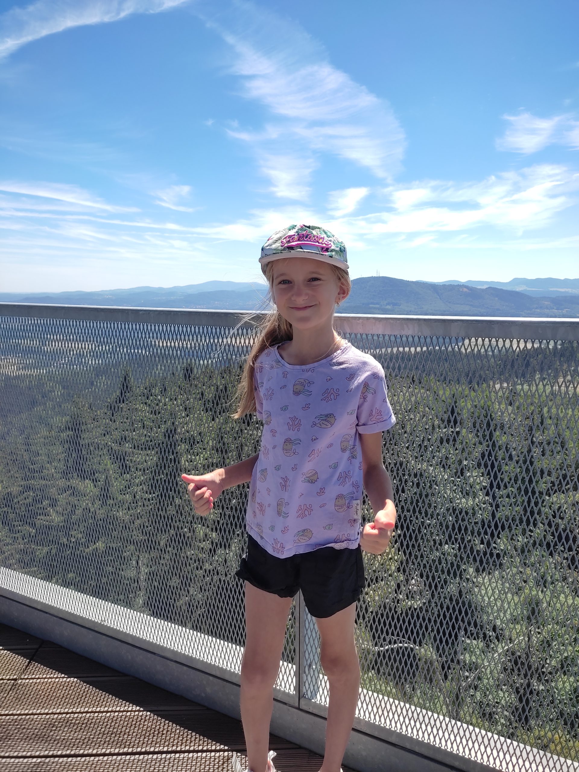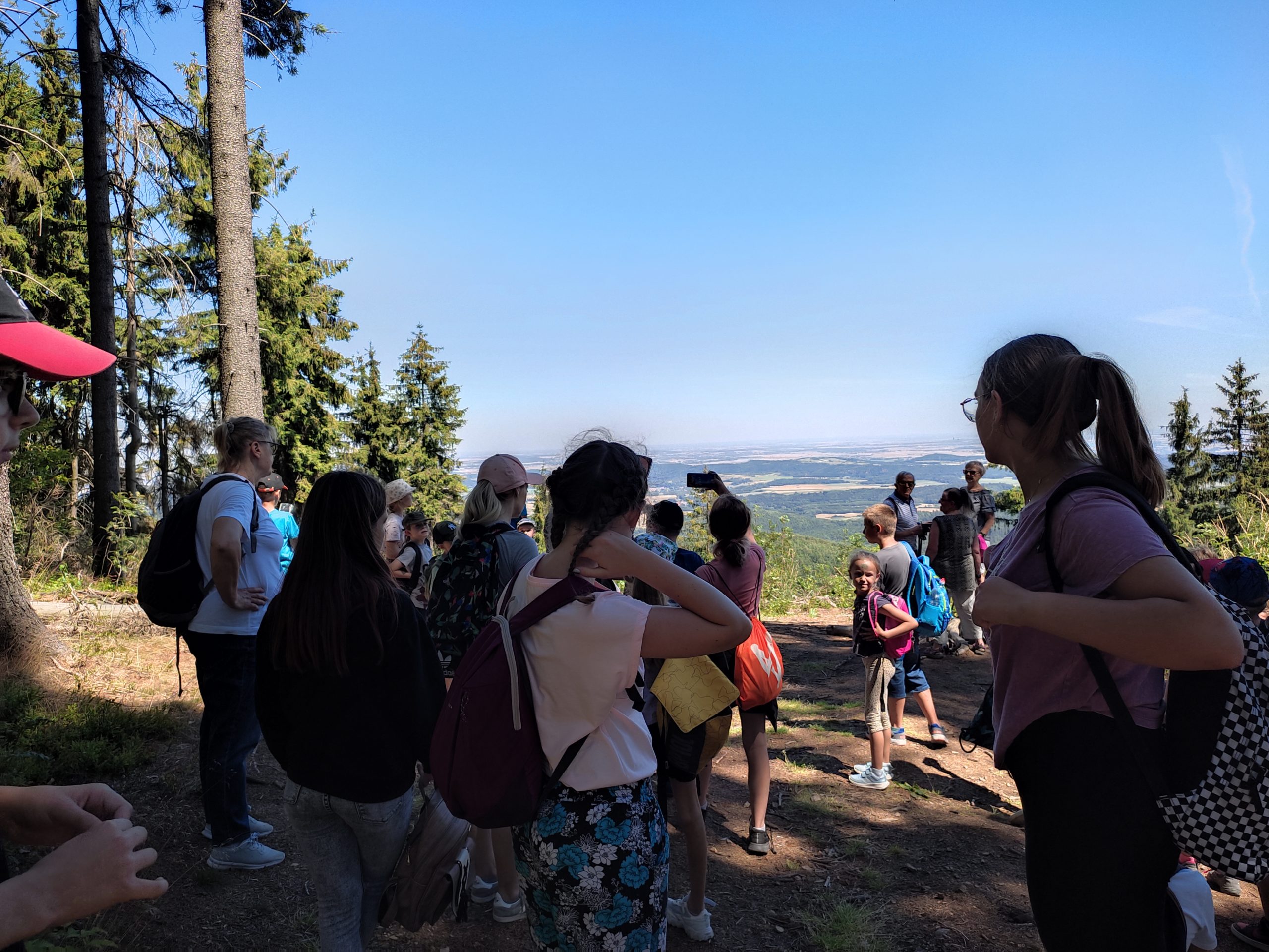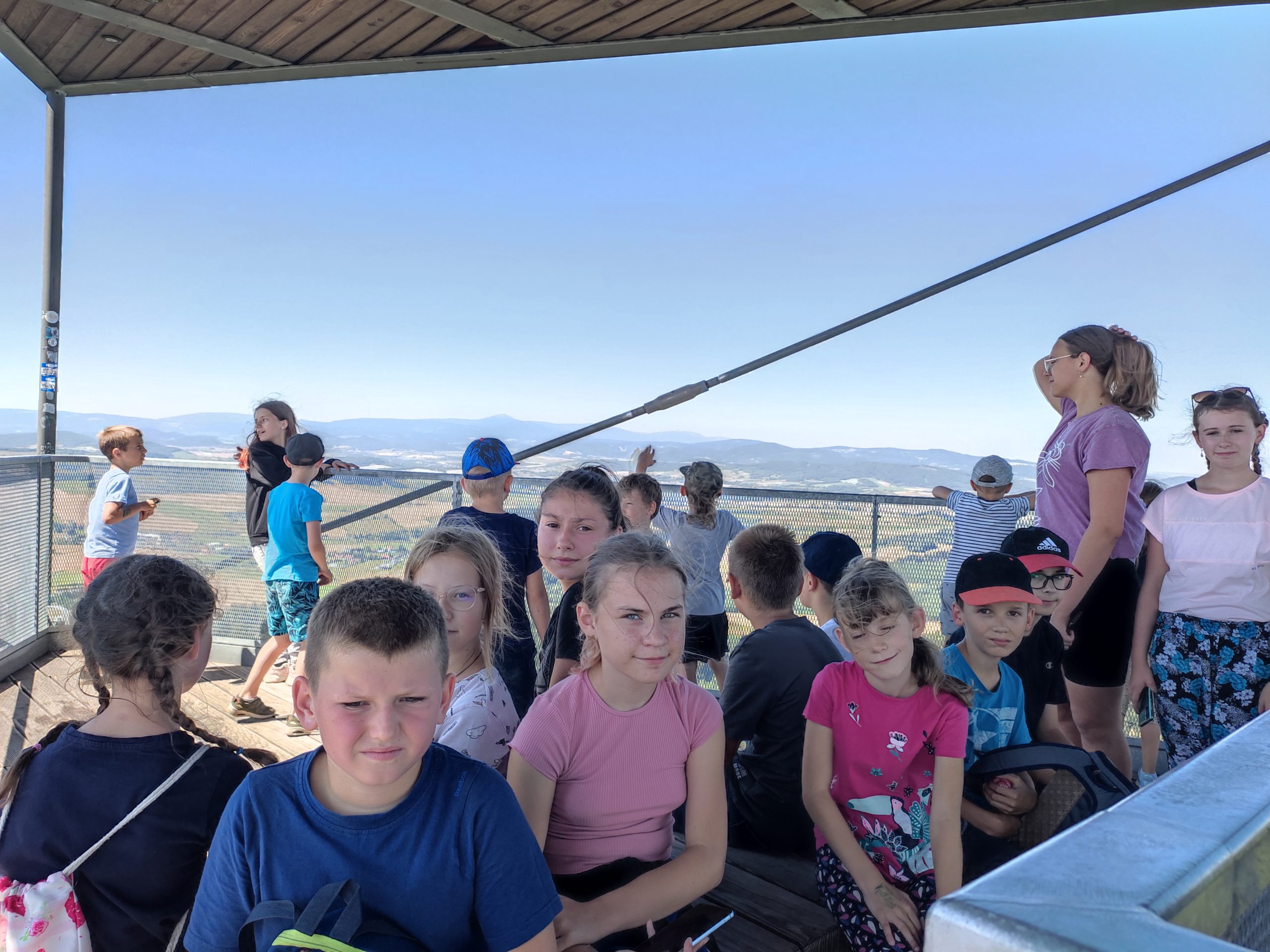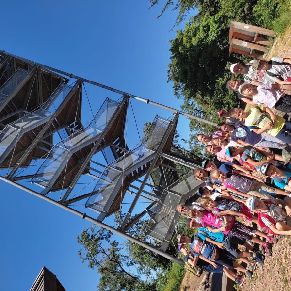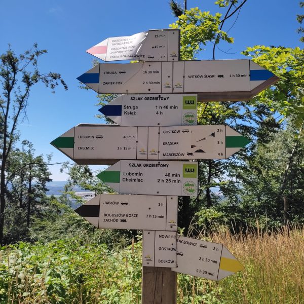 25.07.22r. rozpoczęliśmy nasze półkolonie zdobyciem szczyty Trójgarb (778 m n.p.m.) w Górach Wałbrzyskich. Szliśmy najłatwiejszym żółtym szlakiem z Lubomina, który wiedzie bardzo malowniczą trasą. Na szczycie czekała nas piękna wieża widokowa. Wieża widokowa na Trójgarbie została oddana do użytku pod koniec 2018 roku. Obiekt powstał w ramach programu „Ekomuzeum wokół Trójgarbu”. Budowla ma 27 metrów wysokości i aż pięć tarasów widokowych zawieszonych na różnych wysokościach! Imponujące konstrukcja a widoki z góry cudowne 🙂 Będzie co wspominać po wakacjach 🙂